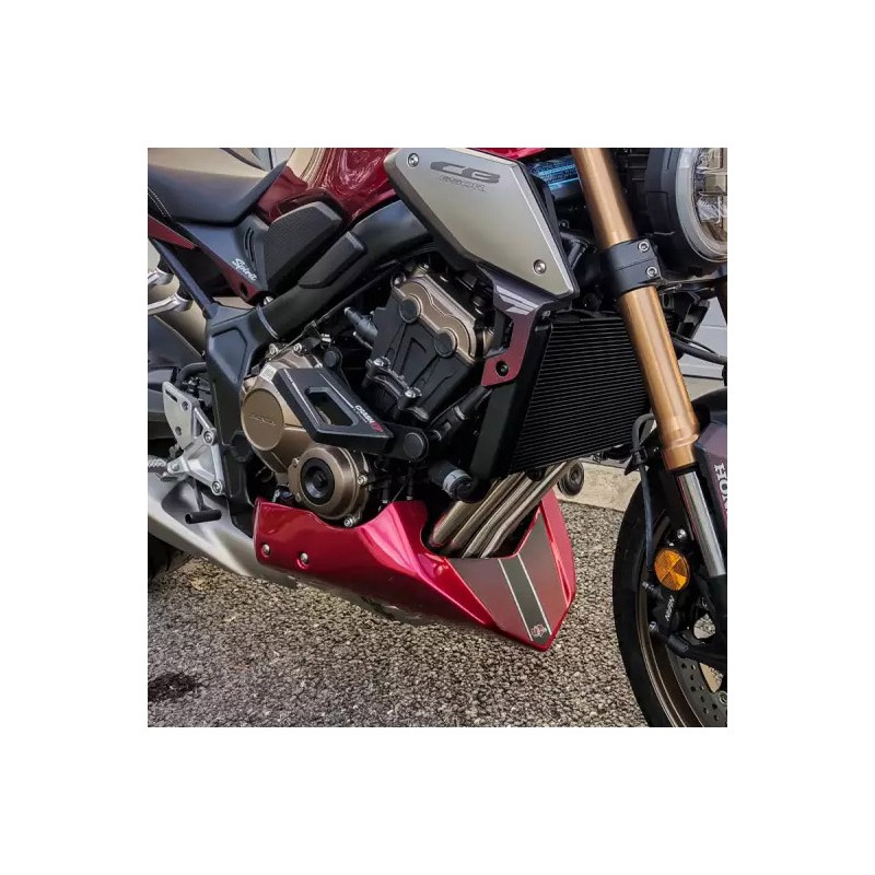 Schützen Sie Ihren Krümmer sowie den unteren Bereich Ihrer CB650 vor Steinschlägen und Spritzwasser mit diesem Motorschutz.