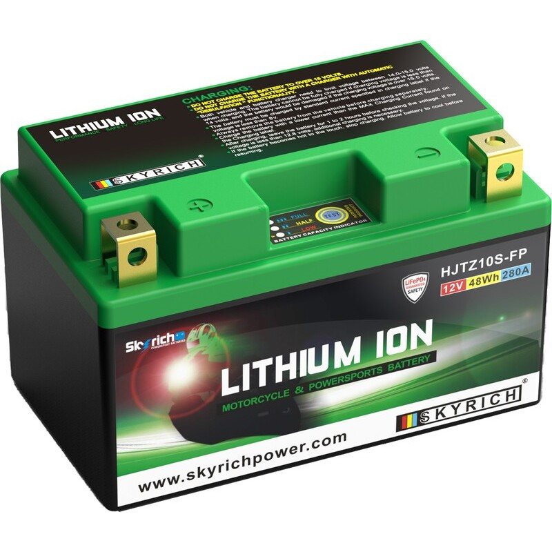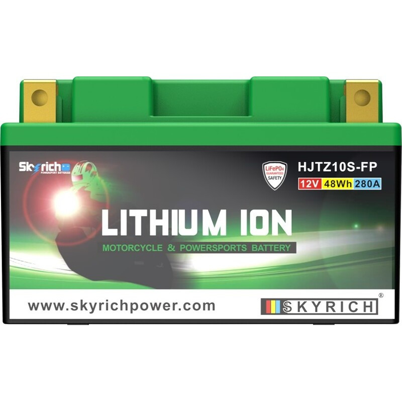 Batería de Litio Skyrich que reemplaza la referencia original Yuasa para una ganancia de peso (¡aproximadamente 1.5 kg!) en la moto.